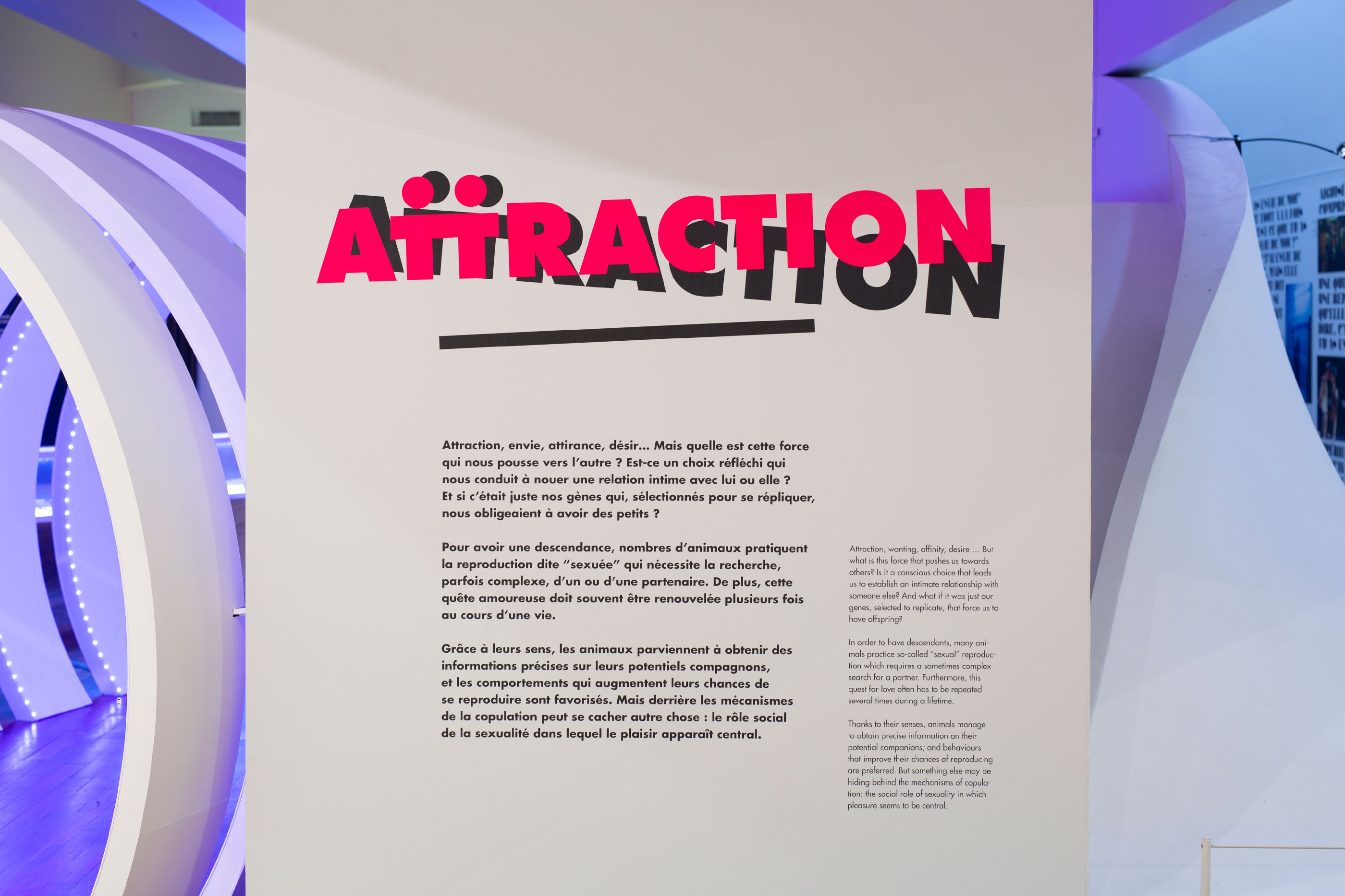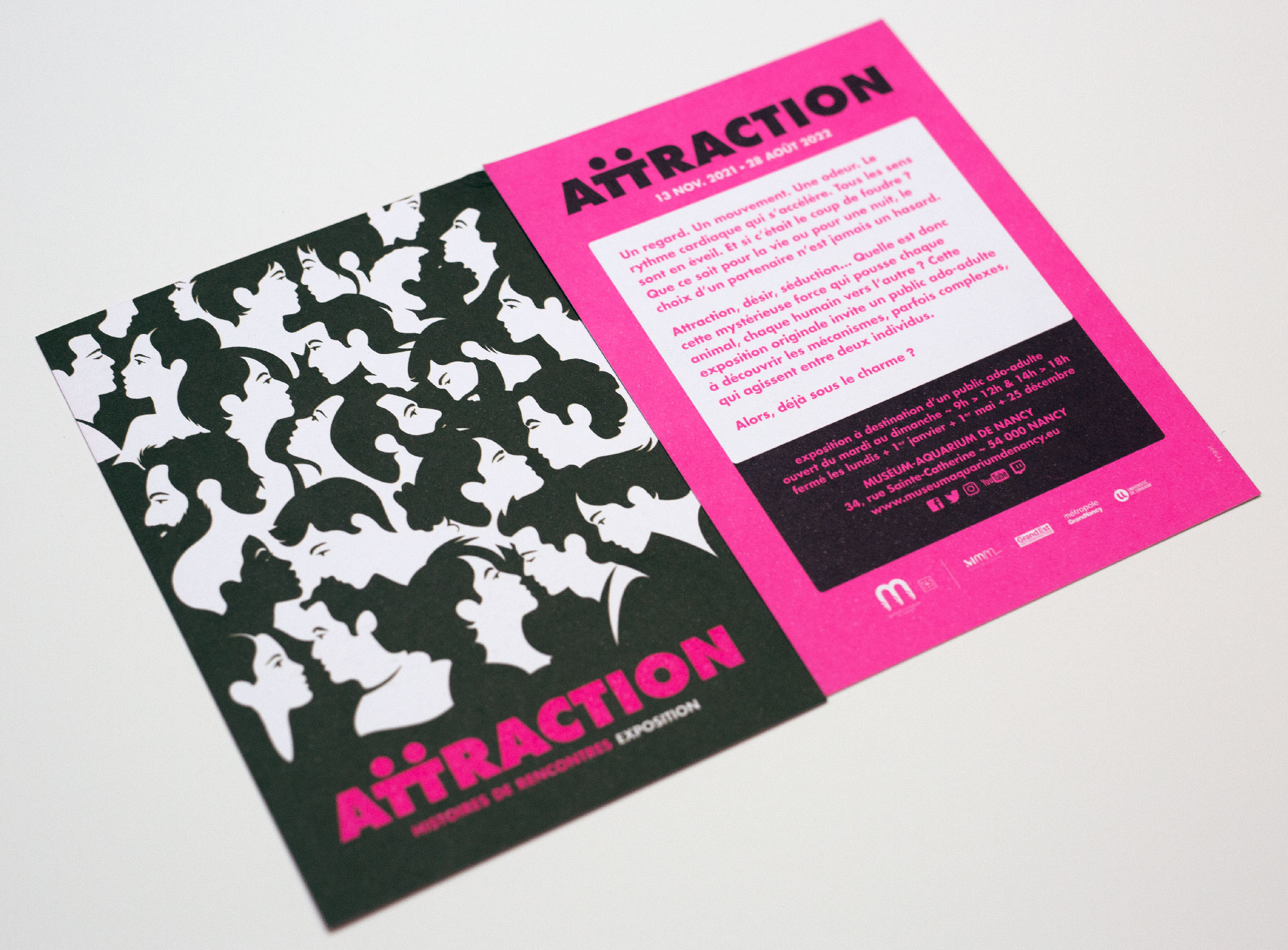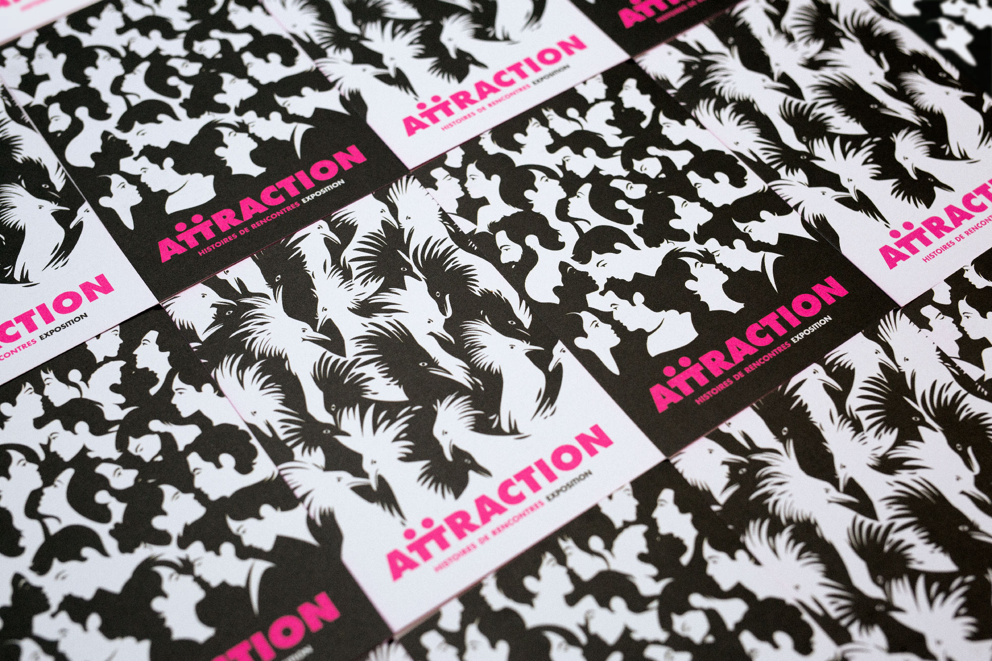 Identité graphique et graphisme de l'exposition Attraction, histoires de rencontres au Muséum-Aquarium de Nancy. Quelle est donc cette mystérieuse force qui pousse chaque animal, chaque humain vers l’autre ? Cette exposition originale invite un public ado-adulte à découvrir les mécanismes, parfois complexes, qui agissent entre deux individus.