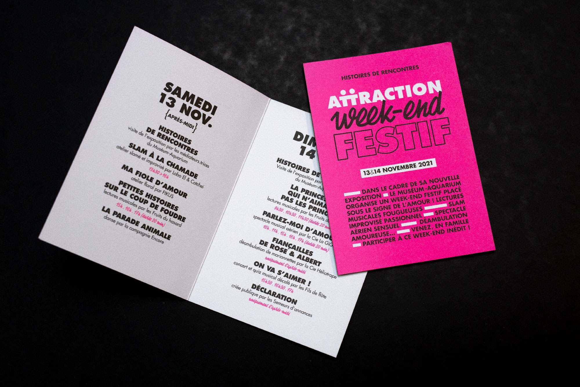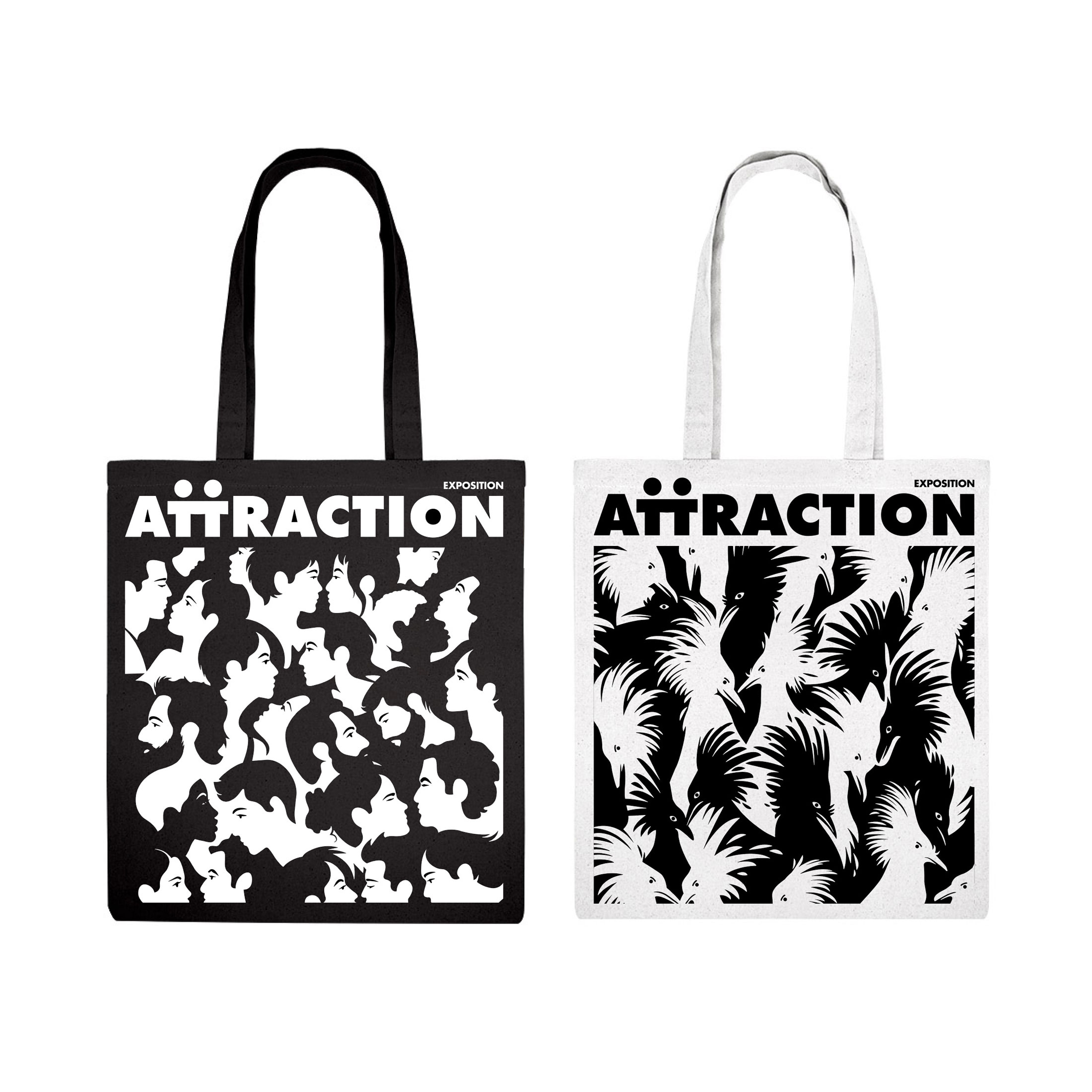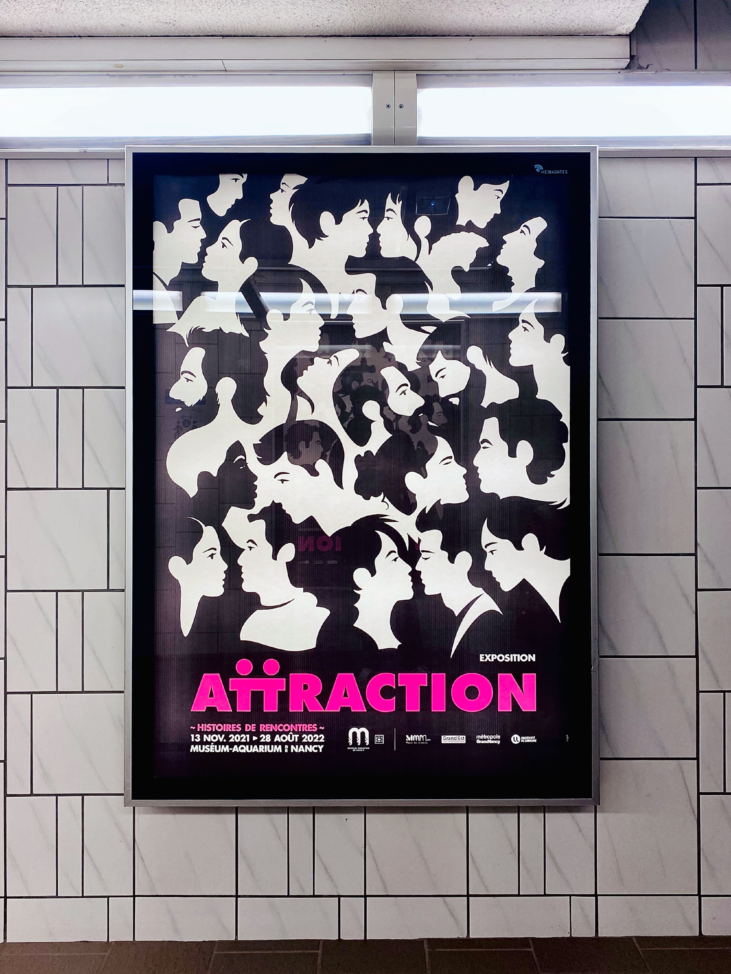 Identité graphique et graphisme de l'exposition Attraction, histoires de rencontres au Muséum-Aquarium de Nancy. Quelle est donc cette mystérieuse force qui pousse chaque animal, chaque humain vers l’autre ? Cette exposition originale invite un public ado-adulte à découvrir les mécanismes, parfois complexes, qui agissent entre deux individus.